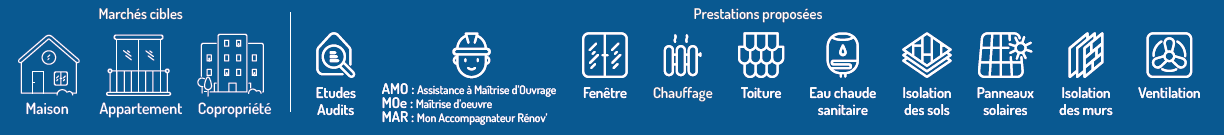 Nous représentons les professionnels de l’immobilier : cabinets immobilier, syndic de copropriété et nos partenaires sont les entreprises du territoire. Nous mettons en relation les professionnels et les entreprises pour réaliser les travaux de rénovation énergétique. Nous formons également les professionnels pour être à jour des réglementations.